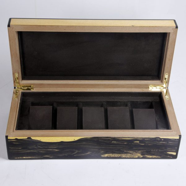 Emplacement pour 5 montres. Livré avec 5 coussins de montres. Coussin de montre sur mesure à la dimension du poignet. Les coussins de montre sont conçus avec deux plaquettes d’ébène massif, de la mousse haute résilience et sont revêtus avec de l’Alcantara.