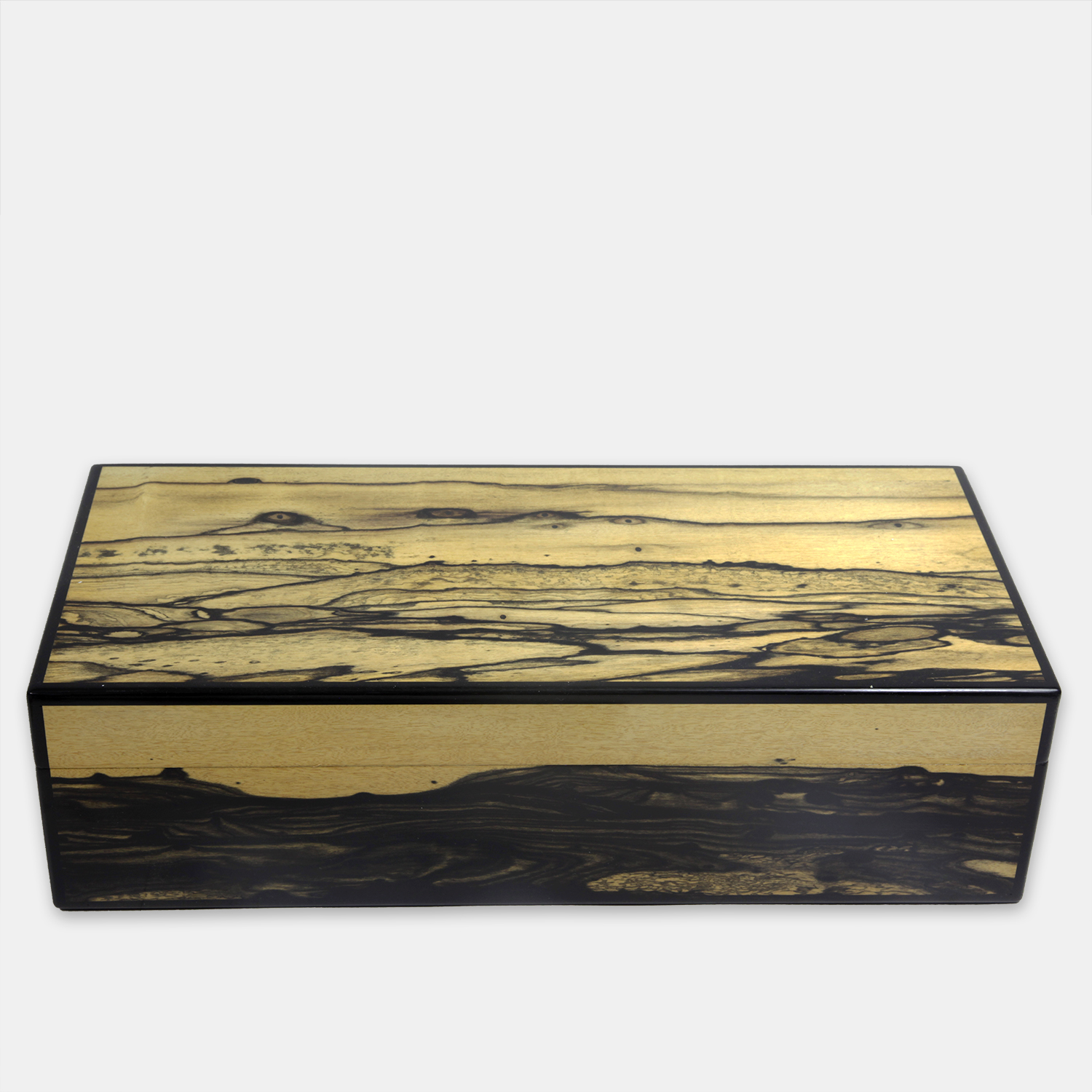 Ebène blanc du Laos. Les baguettes d’angle en ébène du Gabon encadrent les motifs de l’ébène blanc et font écho à son veinage noir.